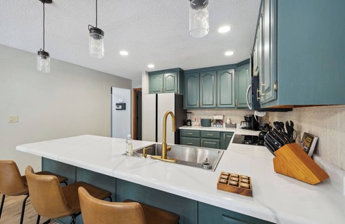 The fully stocked kitchen has everything you’ll need for making meals for the whole group, including stainless steel appliances, a toaster, can opener, and all the basic kitchen essentials like pots, pans, plates, cups, and utensils. There’s lots of counter space with seating available for 4 at the kitchen countertop. The dining room table also has room for 6.