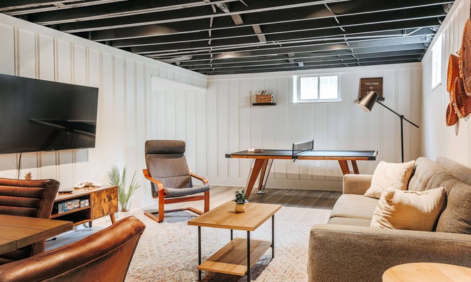 - Living Room: Roku TV (log into your own streaming services), couch, 4 swivel chairs, and coffee table.