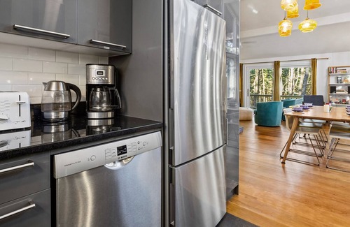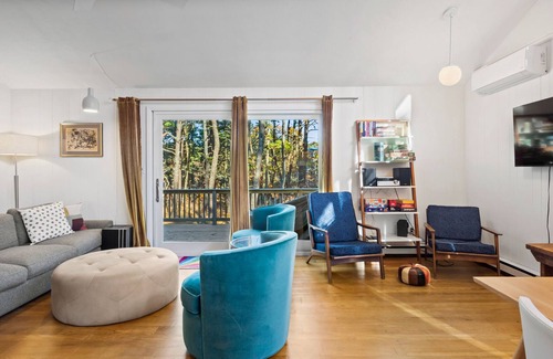 This lovely modern chic getaway located in Wellfleet is full of life with tasteful pops of color throughout the home. Enjoy your morning coffee on the deck in what feels like a bird aviary. Inside, you will find a 14’ vaulted ceiling with an abundance of natural light streaming in, unique modern art, and a custom blown glass chandelier, a centerpiece to the home. The house received a near complete renovation in 2021 including fresh paint, AC/mini-splits in every room, refinished wide plank floors in the living area, new carpet in the bedrooms, and a new kitchen featuring all new stainless steel appliances, modern cabinetry, and granite countertops.