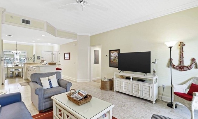Discover the beauty of Hilton Head Island from this enchanting 2-bedroom, 2-bath condo with upgraded walk-in master shower. With a king bed, queen bed, twin bed, and sofa bed, this delightful space is perfect for small groups or families of 7. Enjoy the convenience of 2 bathrooms with a hairdryer and shower amenities. The living room offers additional sleeping space with a cozy sofa bed. Our place is equipped for both long or short stays to make your holiday one to remember.