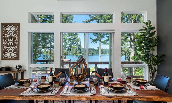 Beautiful luxury lakefront home with a resort feel located on one of Oregons most beautiful lakes will simply take your breath away. Designed with large families in mind, Seven Pines offers two separate living areas. The main level has a master suite with king bed, and two full private bathrooms, a second bedroom with queen bed, comfortable living room with a big screen TV, a fully stocked Kitchen, dining room, Laundry room and half bath. The lower level has bedrooms 3 and 4, both with queen beds, private entrances, lake views, and a shared full bathroom, a small kitchenette, bonus / living area with 2 sets of bunkbeds (full & Twin), very cozy couches, big screen TV, console video game, and a shared full Bathroom. Outside you will enjoy spacious park like grounds with a fire pit in the yard, a private dock, gas grill, patio chairs and dining tables, and absolutely stunning views!