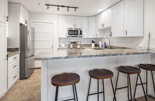 Perfect for couples, families, or friends, this freshly remodeled, 2-bed, 2-bath condo is well-laid out. The kitchen/ living area is open and comfy - perfect for eating, relaxing, and making memories together. The kitchen boasts brand new cabinets and granite countertops, is well-stocked, and includes a coffee bar and all-new appliances and washer and dryer. Tastefully furnished with a sofa with chaise and two recliners, the living area has a large smart TV with Wi-Fi and cable for TV watching / gaming. The owner has also stocked the space with books, games, and puzzles for guest enjoyment. Each bedroom also has its own smart TV for entertainment and relaxation and queen-size beds with plush mattresses. With two hallway bunks with high-quality twin mattresses, this condo comfortably sleeps up to 6 people, affording privacy for all guests.
