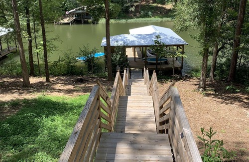 Beautiful and comfortable waterfront home on a quiet cove with a calming view of foliage and lake. First floor has an easy open floor plan of living room and kitchen that leads to a porch with a swinging bed, additional seating and outdoor TV. A main bedroom with king bed, en-suite bath and TV is on the first floor as well. Second floor has 2 bedrooms, each with a queen bed, en-suite bath and TV. Also on the second floor is a lounge with TV and a bunk room with en-suite bath that sleeps 6.