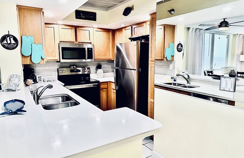 This condo sleeps 4 with a King bed in the master suite and also a queen sofa bed in the living room. It features a cozy great room with a seating and dining area, a comfortable Queen size Eazy bed for extra guests, a flat screen TV, cable and Wifi. There is a half bath off the living area. You will find the kitchen equipped with everything you need to cook a delicious meal. The master bedroom has a king sized bed, TV, and a spacious full bathroom with tub and shower combo.. There are linens, books, games, movies and beach chairs and unbrella provided for your convenience. In the evenings, grill fresh seafood poolside or watch the sunset from the balcony.