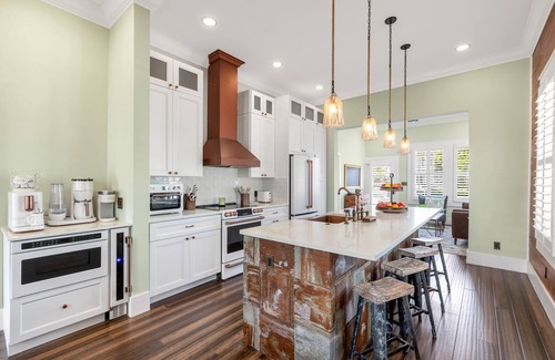 Step inside and you’ll feel instantly at home. The kitchen is modern and fully equipped, with sleek white finishes and custom cabinets that keep everything looking clean and polished. Whether you’re whipping up breakfast or sharing cocktails at the island, it’s a space that makes cooking and gathering easy and fun.