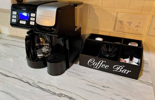 Kitchen is fully equipped with ovens, coffee maker, Keurig machine, toaster and other cooking basics