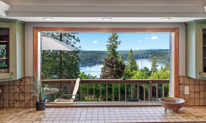 Perched above Hayden Lake, this inviting 4-bedroom, 3-bathroom retreat offers panoramic views, serene privacy, and effortless access to North Idaho’s best attractions. Lounge on the wrap-around porch, soak in the hot tub, unwind with a book in the library or gather around the fire pit table after a day at Honeysuckle Beach or Downtown Coeur d'Alene. With space for the whole group, a pool table, Sonos sound system, 6 Smart TV's (each bedroom has a TV) and stunning lake views from nearly every room—this is your elevated escape above the water. New Hot Tub!