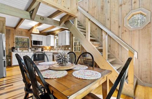 Tucked away in the mountains in Suches, enjoy a river view from almost every room of this quaint cottage. Enjoy time by the fire pit outside or cozy up with a fire inside. Catch a trout or 2 for dinner and grill out on the covered porch. This cabin is literally just a few steps from the River. The loft style bedrooms upstairs provide a beautiful view of the river from the picture windows below.