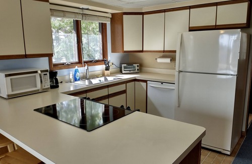 - Kitchen is fully equipped with full size refrigerator, stove, microwave, dishwasher, pots, pans, dishes, small appliances and more