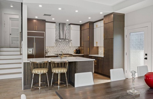 This stunning three-bedroom home was built in 2021. Beautifully decorated with comfortable furnishings, lovely artwork and custom architectural finishes, the modern home has three floors--each with a separate bedroom and bathroom providing privacy and space for all guests.