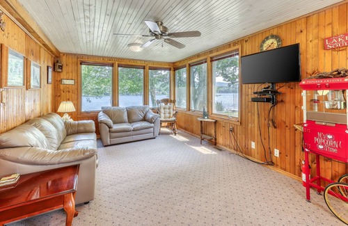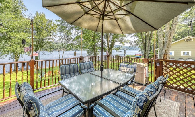 Come and relax by the lake! This home is a perfect, fun getaway for all including the family dogs. Grab an Adirondack chair in the sun and watch boats pass by and kids play in the water. On the deck, you can eat dinner and stay warm with the outdoor stove, while inside, warm up by the gas fireplace, watch a movie, and even have a snack with the provided popcorn maker. For cooking options during your stay, the full kitchen has all of the tools you'll need and you'll find a gas grill outside.