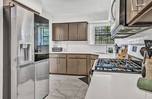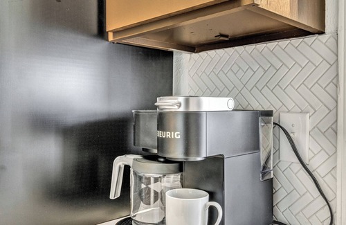 The fully stocked kitchen includes pots, pans, baking sheets, a coffee bar, and kid-friendly plates, bowls, and utensils. The stylish dining area seats 8 comfortably with a high chair provided.