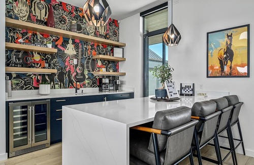 Inside, the open-concept living room and gourmet kitchen are designed for gathering. Home chefs will love creating memorable meals in a fully stocked kitchen with premium appliances, while friends and family relax around the spacious island, dining table, or plush seating. Coffee and cocktail lovers will appreciate the indoor bar, complete with a sink, sonic ice maker, and coffee station. Around the corner, unwind in the media room with a projector for movies, big games, or binge-worthy TV.
