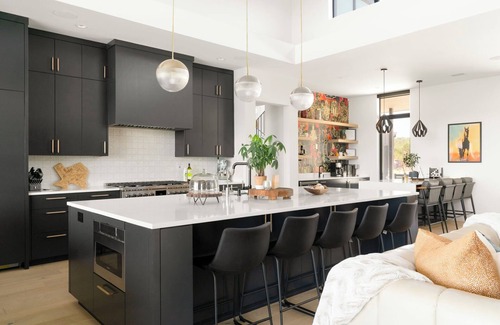 ✓ Dining for 18+: formal table (seats 8), island (seats 6), bar (seats 4)