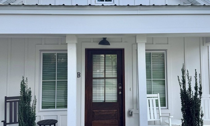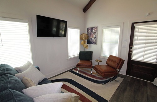 Located in the heart of Downtown Auburn, and only 1 block away from the Auburn University campus, this new 1BR Cottage offers you and your guests the highest comfort and convenience for your time on the Plains! Professionally designed and decorated, the Cottage is the perfect blend of contemporary elegance and southern charm with an open floor plan and gorgeous vaulted ceiling. The kitchen is fully stocked with quartz countertops and top-of-the-line LG appliances throughout, including full Washer & Dryer located off the kitchen. The main bedroom & en suite provides a queen size bed and a beautiful luxury tiled walk-in shower. The sleeper sofa (queen-size) provides space for 2 additional guests as well to comfortably sleep 4. The living room includes a 55" 4K SmartTV with complimentary YouTubeTV (plan includes most major sports channels). Complimentary on-site parking provided (one space per unit).