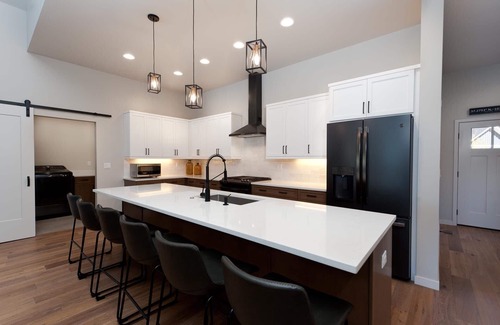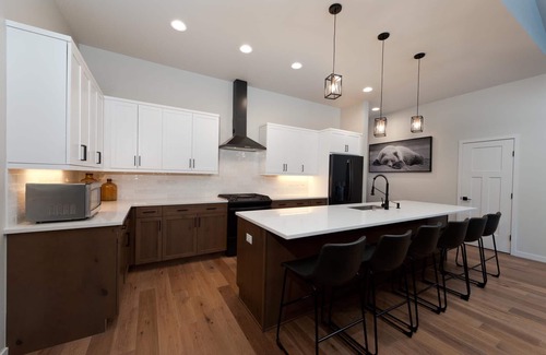 The new home has been outfitted to be the ultimate vacation rental with a private hot tub, huge covered deck with outdoor dining table, gas fire pit and a BBQ Grill as well a 6 ft. Pool Table, Ping Pong and a Shuffleboard table in the garage. The home is perfect for multiple families as it features a 2nd living space with a cocktail arcade game (with 60 classic games), TV and queen pull out sofa.