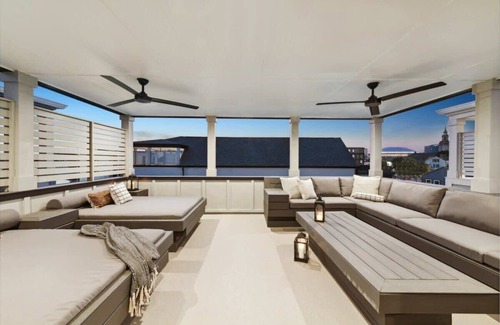 Outdoor Area: This home has a private outdoor area with patio and rooftop deck. The private outdoor area includes a heated pool and spa, lounge chairs, and outdoor shower. The patio has an outdoor seating area and grill. The covered rooftop deck has a daybed, sitting area, and Smart TV.