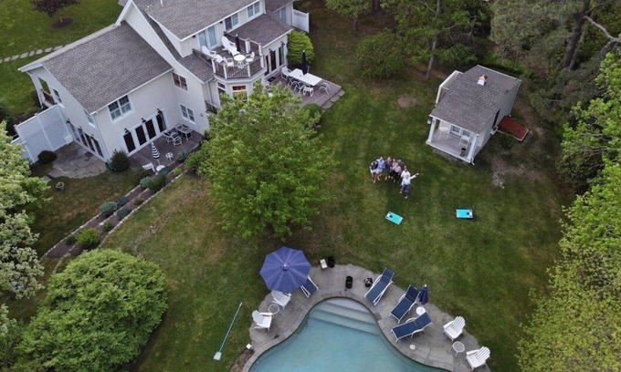 This top notch home with multiple large gathering areas indoors and out with four bedrooms and four and a half baths is situated on 2 acres and backs up to a 100+ acre State Park with fabulous hiking trails. It's multilevel decks and patios, beautiful heated pool , manicured lawns and gardens and shady wooded paths create a perfect setting for enjoyment and relaxation! The master suite, on the second floor, has a king sized bed, luxury en suite bathroom and a private deck overlooking the yard, heated pool and pool house. It has a flat screen TV, large his and hers built in closets and a private nook with a writing desk. On the main floor there are two bedrooms each with queen beds, en suite luxury bathrooms, flat screen televisions and spacious built in closets.There is also a powder room, an open floor plan kitchen with a separate wet bar , dining table and countertop seating and living room and a spacious new deck with built in seating and a new , large Weber grill. The ground level has a large bedroom with a double bed and an extra long twin, hall bath, media center, sitting area with beverage fridge, laundry room and a brand new (10/21)walkout patio with new extra large luxurious hot tub and brand new firetable. Pool house has a brand new gym and powder room plus an outdoor shower! This property is just 80 miles from Manhattan and easily accessible by highway, train and bus. Within 5 miles are ocean beaches, wineries, 3 public golf courses, riding trails, a Tanger outlet mall, a renowned water park and countless restaurants, farm stands and fish markets. A beautiful Peconic Bay beach is less than one mile away- perfect for paddle boarding, kayaking, swimming and enjoying gorgeous views!