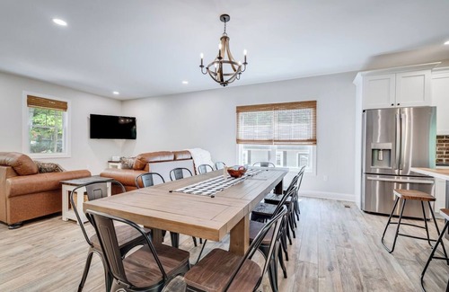 Smart TV in family room. Large dining table that seats 12. Kitchen island with additional bar seating.
