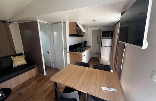 Guest accommodations at New mobile home in Etaples sur mer, 5 minutes from Le Touquet and Sainte Cécile offer coffee/tea makers. Rooms open to patios. Kitchens offer refrigerators, stovetops, microwaves, and cookware/dishes/utensils.