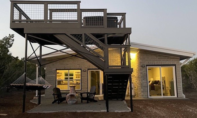 Contain and Chill is a place to do just that "chill." You can relax by the chiminea with a glass of wine, curl up to a good book in the hammock, or hit the deck 12 feet high or 20 steps up, overlooking a panoramic view of the hill country. The deck has a two-person hot tub and sitting area to enjoy the views and catch the most breathtaking sunsets. This view takes stargazing to a whole new level.