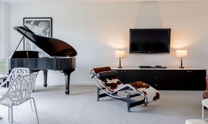 The large great room offers modern and contemporary living. The room has comfortable sofa seating, a tv, piano, dining table, separate work space and the kitchen. There is also access to the apartment’s two patio’s with lovely views of the distant barn, woods, and pasture.
