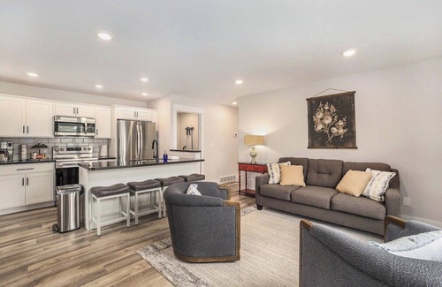 This Airbnb is a brand new! Enjoy the comforts and amenities of this new townhouse. The space includes a full kitchen which is fully equipped for making home cooked meals with fresh ingredients that you may have bought at the local farmers market just a two minute walk away. The living room space is open and conducive to connecting with your friends and family. There is an aesthetic fireplace display which adds a unique ambience and a smart tv that can be connected to your favorite streaming channels. The living room couch is a high end queen sleeper. The main bedroom has a luxurious king mattress and lounge chair. This bedroom has its own very private bathroom with large vanity and shower stocked with high end shower products. The secondary bedroom has a very comfortable queen mattress and is fitted with its own smart tv and its own full bathroom just across the hall with a large bathtub shower and showering products, and large vanity for getting ready for the day. In the evenings enjoy refreshments and grilling out on our outdoor patio space.