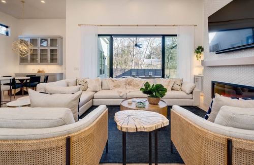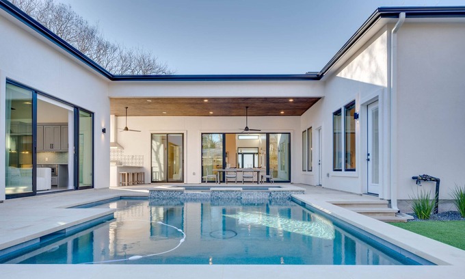This stunning one-story new construction in a classic Austin neighborhood is beautifully decorated and features an entertainer's kitchen with an expansive island. Relax in the living room with views of the fabulous pool and hot tub. There are 3 bedrooms in the home with a 4th room that can serve as an office or bedroom. A separate Casita looks out onto the pool. A great place for a couple to have their own space from the group in the main house. Open to short term and long term rentals.