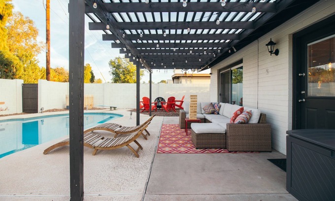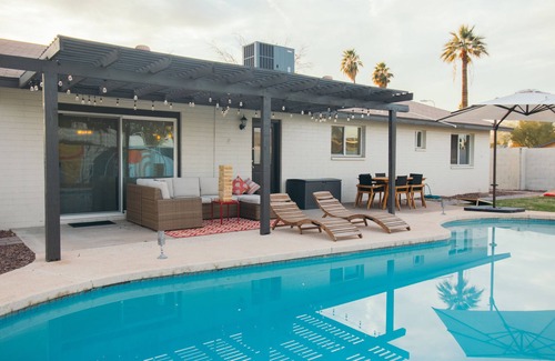 Great location! This BEAUTIFUL home is perfect for large groups and families! Lots of fun to be had in the backyard - a pool, firepit, outdoor dining, cornhole, jenga, plus an original midcentury mural as a gorgeous backdrop for your photos! Large open living/kitchen/dining area & 4 bedrooms / 3 full baths for 8 guests! Even an office space with a monitor, keyboard, & printer to plug into! Just minutes from the airport, ASU, Spring Training, Phoenix Open, Downtown Phx & Old Town Scottsdale!