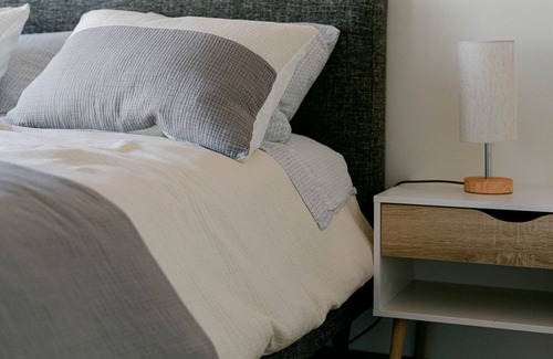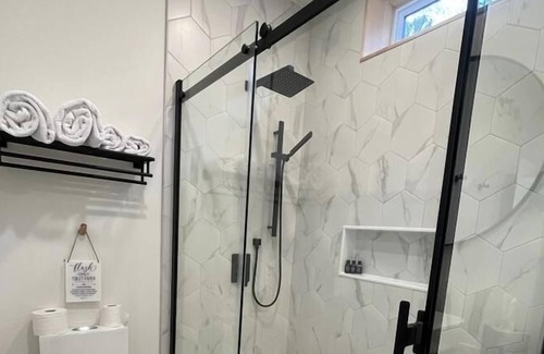 The cottage will comfortably accommodate eight people. On the lower level, you’ll find an open space floor plan with a modern kitchen boasting stainless steel appliances, including a wine fridge and induction oven, a dining area for eight and a cozy living area to enjoy our unique Stuv fireplace. This is also where the three bedrooms are located (two Queen and one bunk bed), as well as a full bathroom, featuring a modern shower, washer and dryer. The second floor has a big sectional and a 75” Smart TV - this is where you can watch movies, play board games, have a karaoke night, enjoying the beautiful views. The sectional has a built-in queen sofa bed and there is another full bathroom on this level.