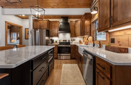 The open concept living, dining and kitchen areas are the perfect setting for sharing stories, playing games, watching a movie or having a meal together. The kitchen has everything you need including a breakfast bar and separate dining area, stainless steel appliances, a Keurig pod machine, toaster, microwave, pots, pans, mixing bowls, mixer, utensils, serving dishes, wine glasses, bartender kit, some essential spices and oil to get you going and much more. Snuggle up with a really good book in front of the wood burning fireplace or kick back on the comfy leather couches and watch a movie on the 55” smart tv. You may want to retreat to one of the 2 primary bedrooms that each have king size serta mattresses, ceiling fans, plush, cozy linens, mountain views, smart tv’s, luggage racks and its own beautifully designed master bathroom. Each bathroom has a shower and a tub. One has a stand up shower and a stand alone soaking tub, the other has a shower tub combo. I