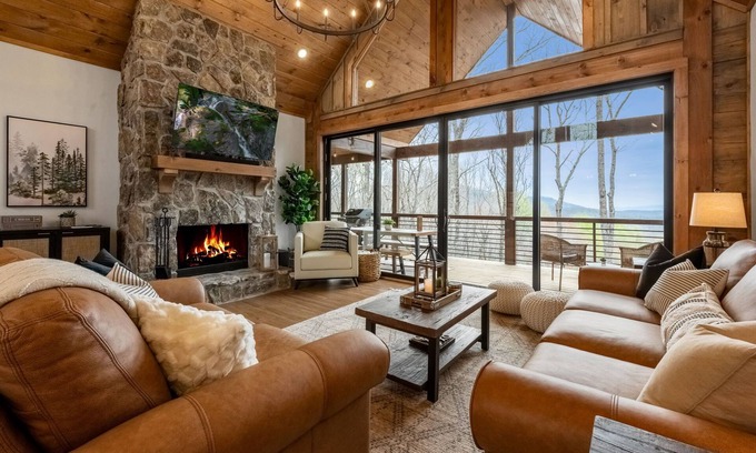 Welcome to On Cloud Wine where you can literally sip your wine (or sweet tea) in the clouds! If you’ve been searching for a place to get away to that will let you relax to your heart's content and build unforgettable moments, then you have found your place!! This gorgeous, brand new, modern/ rustic cabin is perched on the very top of a gorgeous mountain range near Blue Ridge and has everything you need for a dreamy getaway. With unbeatable, year round 180 degree views of the most beautiful rolling hills, mountains, trees, and nature that Blue Ridge has to offer. Breathe in the crisp, clean air and just unwind. Whether you’re looking for a romantic get away, some time with friends or family or just to regroup, this cabin has it all. You will awaken to a glorious sunrise while you sit in your rocking chairs on the front porch sipping your morning coffee. Start your morning with a peaceful morning stroll at sunrise and enjoy the fresh air, and the occasional white tailed deer who freely roam the area.This home has all the amenities including wood and electric fireplaces, a fire pit, a gourmet kitchen, outdoor living space and hot tub. If you decide to venture out and see all that this amazing area has to offer you will see that you are just minutes from historic downtown Blue Ridge where you will find some of most amazing little shops, restaurants, a drive-in movie theater, Blue Ridge scenic railway, sample craft breweries, wineries, distilleries, friendly people, galleries and more. You’re also a short, 20 minute drive to Ellijay where you can enjoy restaurants, shopping, tubing, kayaking, apple picking, wineries, and more.