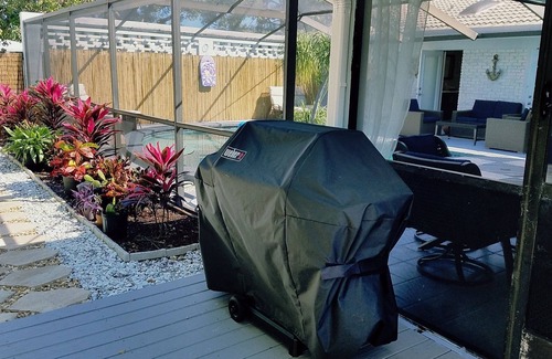 Perfect Pompano Beach getaway with resort style pool area. Newly renovated open and spacious home has three bedrooms, two baths and a heated saltwater pool. It’s a great place for your family and friends to escape! This home has five entry ways to the pool because your backyard is property of its own! The large deck consists of: screened heated pool, Wifi Integrated 55 " Smart TV, endless choices with multiple seating areas throughout the pool area. Gas grill in garden area ready for use.