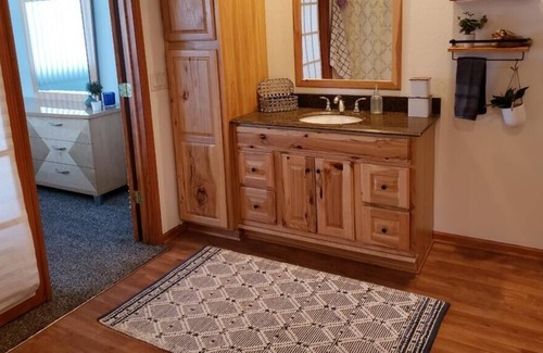 All 3 bedrooms have comfortable beds with plenty of pillows and blankets. The lower level master bedroom looks out onto the lake, has a comfortable king sized bed and has a large bathroom attached with a shower.