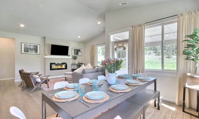 The Space: We hope our home will be a haven for you to unwind and enjoy mindful moments with your family and friends. In addition to the four ample bedrooms that ensure plenty of privacy for your entire group, we also have a sleeper sofa in the office for an additional sleeping space. Youโll enjoy gathering together in our open living room, beautiful dining room, and upstairs lounge. Our property spans more than two acres and is surrounded by mountains, offering hiking opportunities of all difficulty levels. We have a huge playground on-site for your kiddos to enjoy, and it is ideally suited for children ages three to twelve. Please note that we do not have a fence around our property and are not responsible for any injuries obtained while using the play structure. Enjoy the great outdoors, and relax under the expansive partially-covered patio to bask in the sunshine by day or stargaze by night.