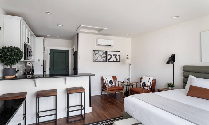 Thoughtfully and meticulously designed to offer you the tranquility you deserve, located on the second floor, featuring a mesmerizing scenic view, a plush king-sized bed, a sitting area perfect for morning coffee or an evening of relaxation, an ultra-modern ensuite bathroom with a waterfall shower, and a fully equipped kitchen with stainless steel appliances. The studio is also pet-friendly, so you can bring your furry friend along.