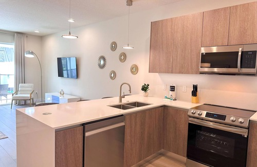 You will love the layout. Downstairs there is a queen size bedroom with ensuite (shower). A fully equipped kitchen with dishwasher, stove, microwave, fridge, coffee maker, utensils, pots and pans, dinnerware. The living room and dining room are spacious and tastefully decorated. The view on the pool is just wonderful as you will have no rear neighbors. Upstairs, there are two more bedrooms. One primary bedroom with a king size bed and ensuite (shower). And a third bedroom with bunk beds and an ensuite bathroom (bathtub). And on top of that, there is a den with couch and TV sot that you can work or chill in a quiet place. This property is brand new. It is a gem. Do not wait as it could be booked before you know it.