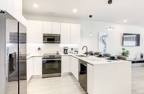 !!!Please contact us for monthly specials (up to 3 months)!!! Welcome to this brand new villa is located in the desirable new subdivision of Hidden Forest, only 15 min from Disney and 5 min from all stores (24/7 Walmart nearby) and all main restaurant chains. Close your eyes and imagine! You will LOVE the open-feel, the Modern-style cabinets in the kitchen and in the bathrooms. The kitchen is fully equipped (dishwasher, pots and pans, fridge, microwave, oven, stove, air fryer...). It sleeps up to 8 guests. All rooms have smart tv's with cable. The kitchen and living room have direct view and access to the pool area. There is a Mickey Mouse queen bedroom downstairs with ensuite. Upstairs you will enjoy the huge master bedroom (king with ensuite) and the Mickey & Friends theme with ensuite (two bunk beds). There is a den with a couch for you to enjoy some me-time or work-study in your own space. Your reservation also gives you complimentary access to the clubhouse (gym, heated pool and spa, kids playground, game room). Book it or you may lose it. This property is going to be extremely popular. it sleeps up to 8 guests comfortably. *Pool heating is NOT included in the rental unless specified in your rate. Please contact us to get a quote. You can still use the pool without heating, of course. ** Only the guests who have been registered are allowed to stay in the property. *** Pool heaters are set to 86 prior to your arrival. The reached temperature will depend on the weather. Pool heaters run 12 hours during the day. No refund or compensation will be given if the pool heater does not work unless the guests paid for the heating of the pool and it is proven that there was a technical issue that created an inconvenience. The refund or compensation will never exceed the amount paid by the guest for the heating of the pool.