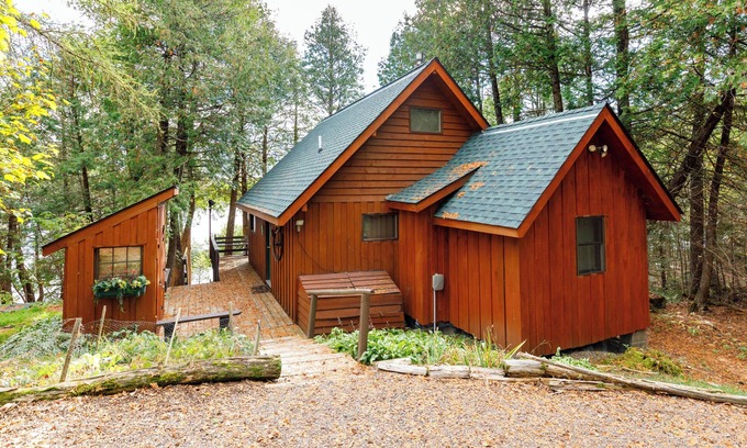 There are two bedrooms (1 queen each, sleeps 4 total) and 1 bathroom. Enjoy the open layout with floor to ceiling windows full of sunlight and views of the lake as well as huge, beautiful cedar trees and sometimes even a moose or two (rumor has it that our property is a favorite grazing spot on this road!).