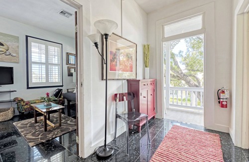 The long driveway offers off street parking, a rarity in Old Town. Use the space for cars, bikes, golf carts or scooters; there is plenty of space available. The front porch is calm and luxe, and the perfect place to enjoy morning coffee or a happy hour cocktail and watch the world peacefully pass by. From the white picket fence to the detailed wooden craftsmanship, every aspect of Seaside Place is a reminder of your Key West experience. The side porch houses luggage storage, should you need space to store your items outside of check in/check out hours. Trash and recycling recepticles are tucked away at the back.