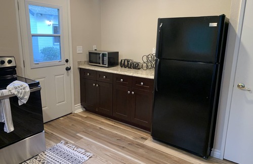 Our newly furnished and remodeled guest house is ready with all the basics you need for a long or short stay. This spacious 1 bedroom 1 bathroom private unit includes a full kitchen with an electric stove/oven, refrigerator, lots of counter space and a nice sized closet pantry. The living room/ dining area includes a table and 4 chairs, a new sofa that pulls out to a double sized bed, smart tv and access to your own private deck overlooking the backyard filled with giant trees, greenery and a pool. The large bedroom features two full sized closets, a California King sized beds workspace with desk, and blackout curtains over the windows to ensure proper sleep no matter the time of day. The spacious bathroom has a shower tub with excellent water pressure, double sink vanity, toilet and a skylight for more natural light. Small, well behaved, housebroken, indoor dogs welcome. Unit is completely detached from main house with private entrance and no shared walls. No animals allowed on property at all. Our Saint Bernard is friendly to humans but extremely reactive to other animal. In order to maintain a safe environment for everyone we do not allow animals on site ever.