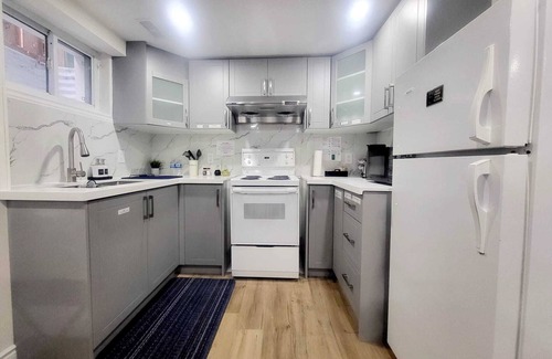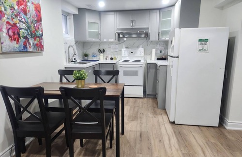 Indulge in our retreat for 1-4 guests, blending comfort and luxury. Enjoy high-speed WiFi, Netflix, a Queen bed, and a Sofa bed. Thoughtful amenities include a full kitchen, in unit laundry, and work space. Our private basement unit is located in downtown Mississauga, steps from transit, Celebration Square, and Square One mall. Indulge in culinary delights with an array of dining options and convenient grocery stores nearby. Ideal for families or professionals seeking comfort and convenience.
