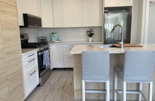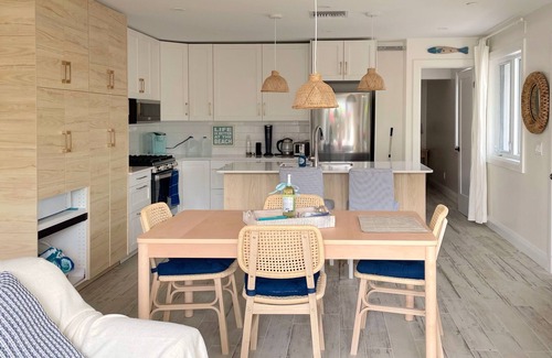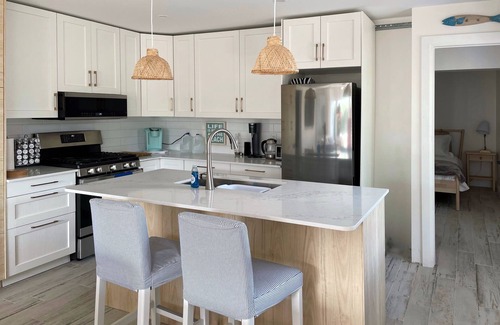Seashell Cottage has an all new light filled open concept kitchen/living/dining, with a 55" TV, and a comfy sofa bed for an extra guest or 2 children. The primary king bedroom has an ensuite w/shower, the second bedroom has 2 single beds that can form 1 king bed, also featuring an ensuite bathroom with a bath/shower. The cottage offers a flexibile 3rd bedroom/office/den that has a cozy single daybed that can be converted to a king. There is also a fold out office table for 1 or 2 people, and a large monitor, in case you need to keep up with your work responsibilities. A lush private patio includes seating, dinning & BBQ Grill.