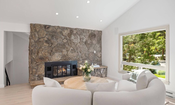 Experience the perfect blend of luxury and functionality in our spacious home. The open-plan upstairs living room features a cozy fireplace and a small art TV, ideal for unwinding after a day of exploration. The modern kitchen with high-end appliances is ready for your culinary adventures. The large adjacent dining room is perfect for hosting.