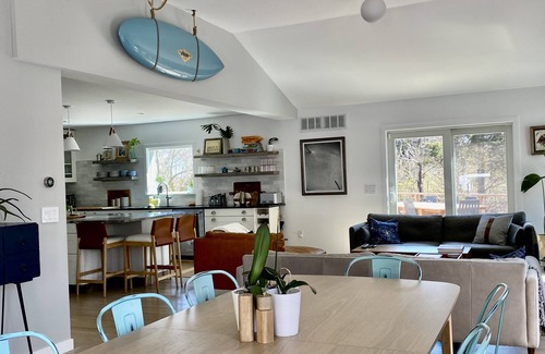 Enjoy convenience in a tranquil setting this summer. This house is stocked full of features vacationers will love! Hardwood floors, 4 bedrooms, 2.5 bathrooms, central AC! New chef's kitchen, private heated gunite swimming pool with bench, sun deck & lounge chairs all around. Spa-like outside shower, front porches, back deck, hammock, totally fenced in yard, privacy! Open floorplan, designer decor, custom furniture, reclaimed wood accents, awesome artwork! Big screen Smart Samsung TVs, soundbar with BT, premium channels, fast WIFI. Brand new Tempurpedic mattresses, luxury sheets, towels & ceiling fans in the bedrooms! Fully stocked with everything you'll need to enjoy the beach, or entertain friends. Main floor powder room, pantry & mud room off the kitchen, new stainless appliances, large kitchen island, 8 burner dual fuel range with double ovens, 33" main sink, disposal, 24" prep sink, instant hot, pot filler, wine fridge, coffee bar! 6 burner outdoor grill, indoor & outdoor dining, plenty of cookware, Nespresso! Towels, linens, beach chairs, beach towels & toys, pool towels, floats, coolers & bikes are all provided. Laundry in the basement, solar on the roof, fireplace on the main floor. Large shed in the front yard for all your gear with surfboard rack outside. The backyard was expanded & is larger than ever with a privacy screen of evergreens and other lush plants surrounding the backyard & pool area. The garage and pool were built this past winter, making almost 50% of the house new construction. Follow danakris on Insta for a video montage of the entire build in the highlights. Garage & space above remain unfinished & are locked off.