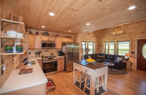 Located on the banks of the North Fork of the New River in Creston, the brand new cabin has taken mountain chic to the next level with tasteful décor and all of the amenities you need to feel at home—not to mention a few extras like a vintage video game that is sure to delight the young (and young at heart).