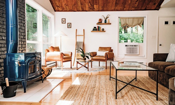 Get snug in front of the wood-burning stove that anchors the living room as the center of the home. The full wall of windows offers a picturesque backdrop overlooking the wooded landscape and Lehigh River, and during the day will leave you flooded with natural light. Watch a movie on the WiFi-enabled 70-inch smartTV while nuzzled up on the family-sized sectional, or cozy up in the reading nook next to the window with your favorite book.