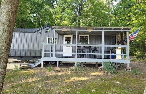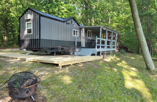 Robin's Nest is a super cute and new lakefront tiny house located on Turk Lake just north of Greenville, Michigan. It features electric heat, air conditioning, Wi-Fi, television, and a great lakefront deck with a gas grill, outdoor dining, and a nice view of Turk Lake. Also includes lake access with a private dock on the lake and a private bonfire ring! Large yard, very safe, very private, and makes for a great romantic getaway for couples!