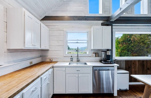 Inside the cabin, you'll find everything you need for a comfortable stay. The well-appointed living area boasts plenty of natural light, comfortable seating, and a cozy wood-burning fireplace. The kitchen comes fully equipped with everything needed to prepare meals during your stay, and the dining area provides the perfect spot to enjoy a home-cooked meal with loved ones.