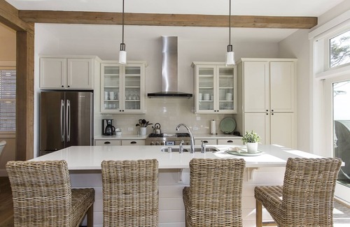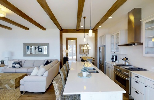 Professionally decorated by Lisa McElliot of SeaWorthy Home, this luxury property was designed with your ideal vacation in mind. Beyond the striking entry framed by rustic beams, the sweeping ocean views will draw you in. The living, dining and kitchen areas share an open floor plan that can easily accommodate large groups. High ceilings add an elegant feel to the living area, which is comfortably furnished with a large sectional sofa, two swivel chairs that turn to view the ocean, a gas fireplace and flat-screen TV. Gourmet and casual cooks alike will appreciate the open kitchen, which is the perfect place to prepare a fabulous meal.